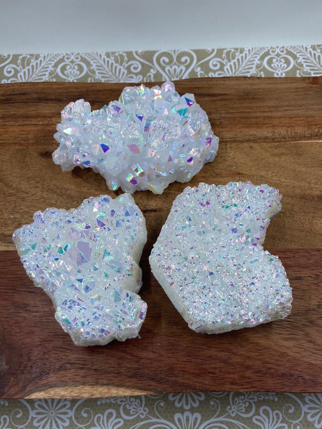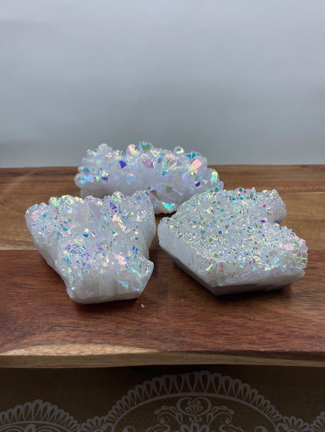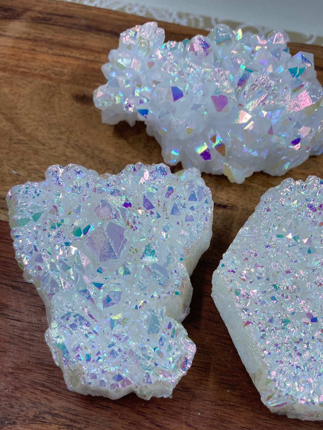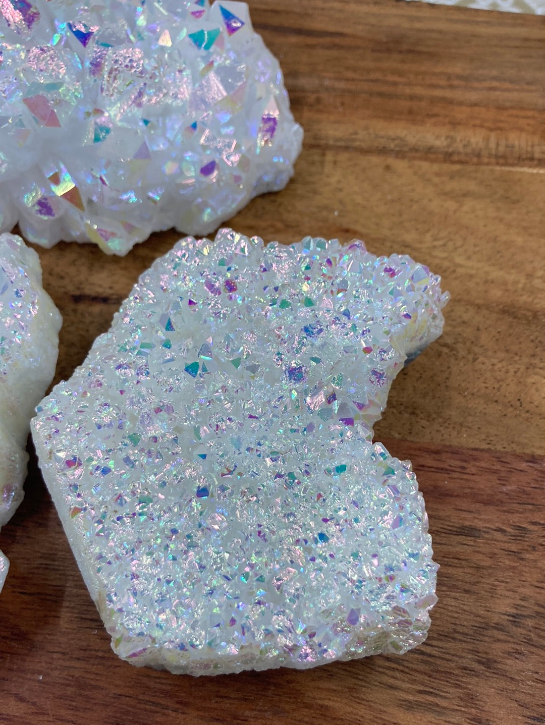 Angel Aura🖤Rainbow Aura🖤Cluster🖤average size length 7.3cm🖤Angel Aura Quartz is an extremely high vibrational stone that’s energies can be felt to the touch, no matter the sensitivity of a person. This magic mineral can provide enough energy to fill environments with endless rays of joy, happiness, and uplifting energy. Angel Aura Quartz is the perfect stone to help when one may feel emotionally unstable or distressed. The energies that radiate from this stone provide a protective shield around ones aura that helps provide inner peace, mental clarity, heightened intellect, and pure serenity. This stone is here to provide these energies on the worst of days to get your emotional body in check, while clearing up the mind of the daily mental fog. Angel Aura Quartz will assist in the complete evaluation and transformation of ones current life, and push one to take action and do what they truly love. This powerful crystal will help keep one's goals and dreams in check, and help in providing a pathway to those dreams. Nothing in this world is out of your reach, and Angel Aura Quartz should be a daily reminder of that.